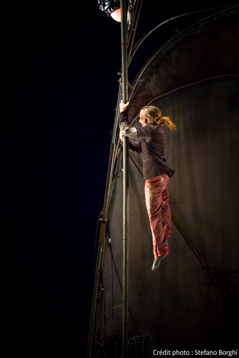Comme dans les spectacles précédents cités ci-dessus, la présence humaine, si insignifiante soit-elle, se confronte à des structures gigantesques, y trouve sa place et son audace. Que Rocco Le Flem partage cet espace aérien avec un oiseau dit bien que l’homme n’est pas seul dans la nature et qu’il doit entrer en relation avec les autres vivants.