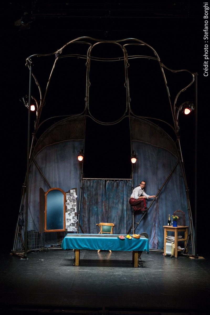 Ce qui l’intéresse, dans l’actualité, ce sont les articles qui parlent de lui, enfermé dans sa maison où lui sont servis, comme par magie, plats, boisson et médailles. Il n’y en a que pour lui dans un monde factice où l’heure est mise en cage. Il semble s’inquiéter de ce qui se passe dehors et regarde régulièrement de l’autre côté du rideau qui ferme la pièce. Jusqu’à ce qu’apparaisse un oiseau, un vrai, aux multiples couleurs, qui l’amènera à se dépasser, aller plus haut, « être du bond » (pour reprendre une phrase de René Char) et se risquer dans les structures d’un décor aux formes végétales comme les a affectionnées l’Art Nouveau.