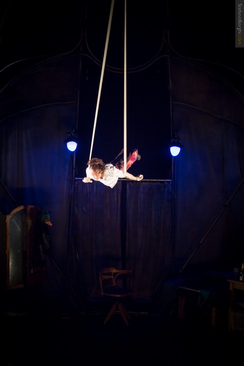 Cette création est aussi une performance physique, l’artiste convoque toutes les techniques circassiennes ainsi que du dressage d’oiseau. « J’ai voulu y mettre tout ce que j’ai appris ces dernières années, allier ma technique de gymnaste à la créativité du spectacle vivant ».