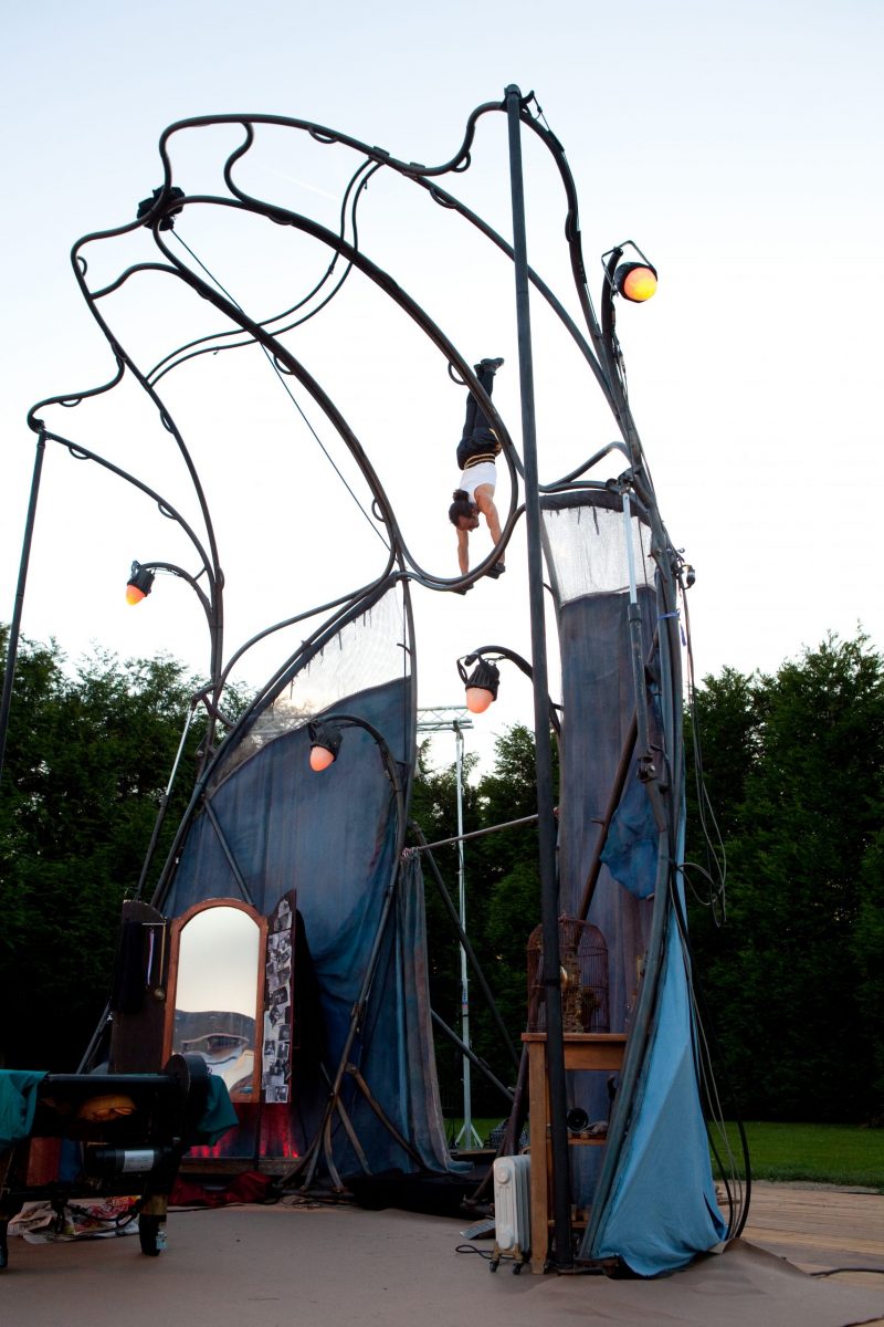 Un décor, évoluant de Fando comme Lis à Racines, une architecture où l’acrobate peut tenter toutes les façons de résister à la pesanteur : verticalité mais tête en bas, horizontalité sur le mât chinois, et même l’envol, un instant aidé par les ailes de l’oiseau multicolore