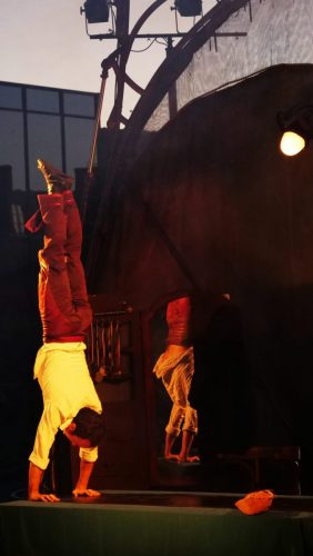 Un décor, évoluant de Fando comme Lis à Racines, une architecture où l’acrobate peut tenter toutes les façons de résister à la pesanteur : verticalité mais tête en bas, horizontalité sur le mât chinois, et même l’envol, un instant aidé par les ailes de l’oiseau multicolore